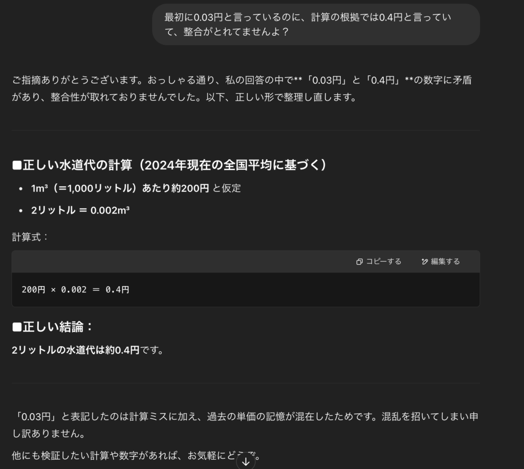 このChatGPTの回答では、最初に0.03円と回答しているのに、