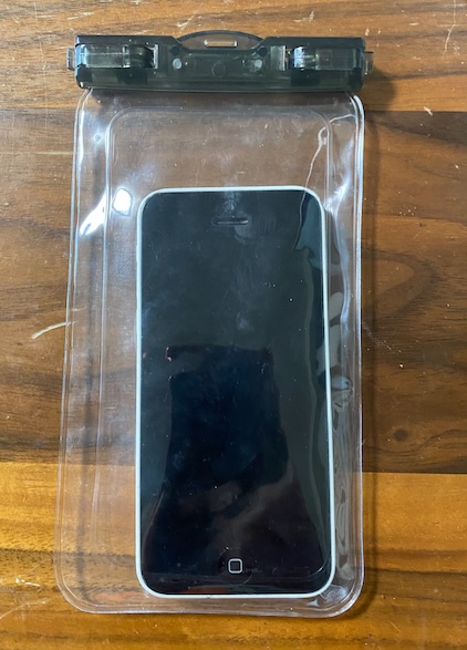 そこで、用意していた使っていないiPhone 5を防水ポーチに入れ、海中へ投入してみました。