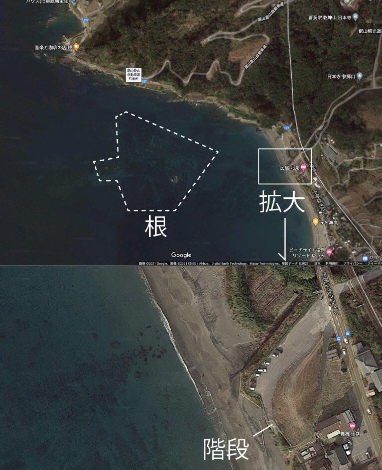 ちなみに、海底の根の様子は、なんとなくですがGoogleマップの航空写真でも確認できる気がします。