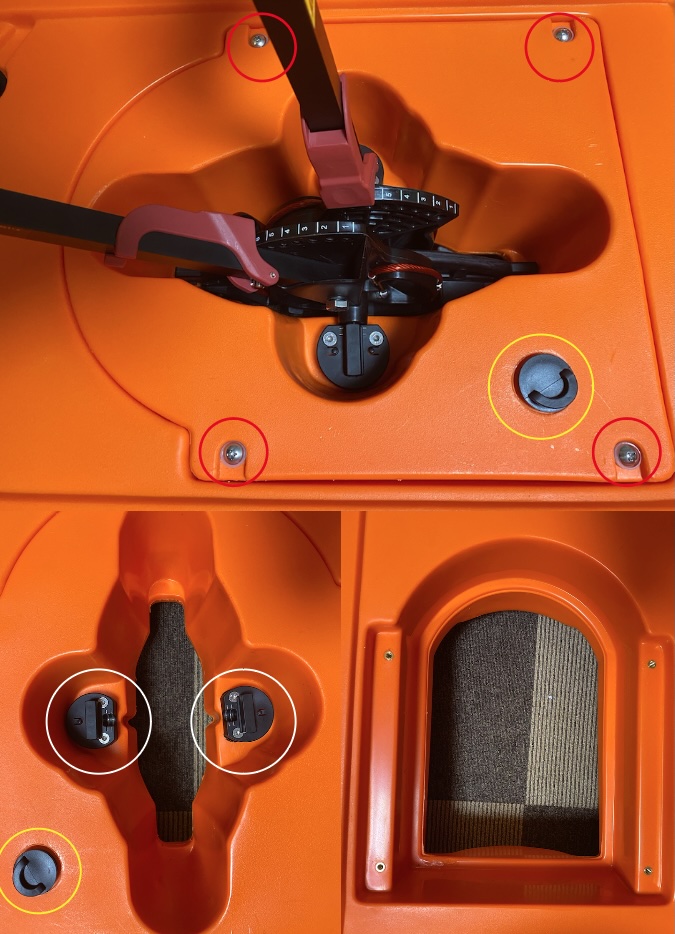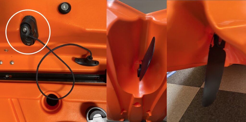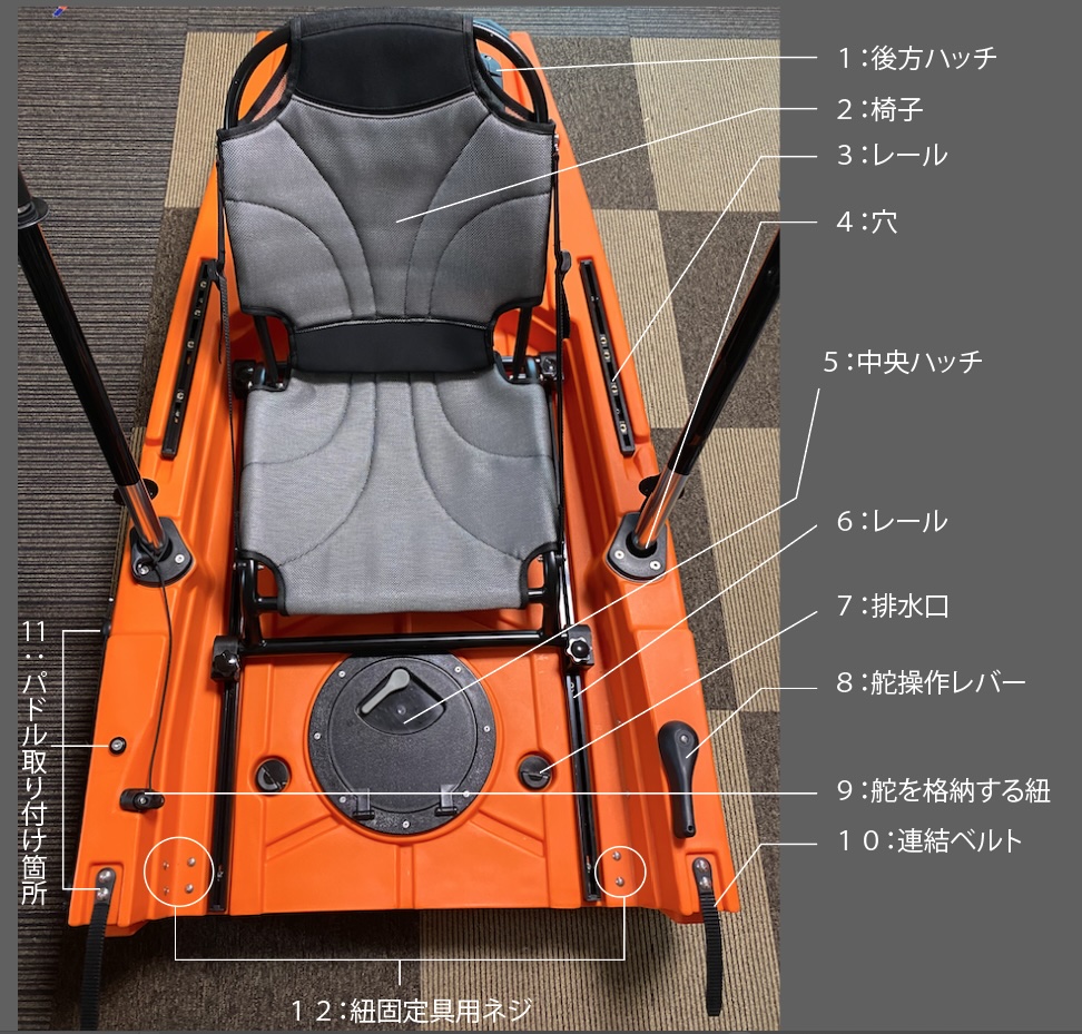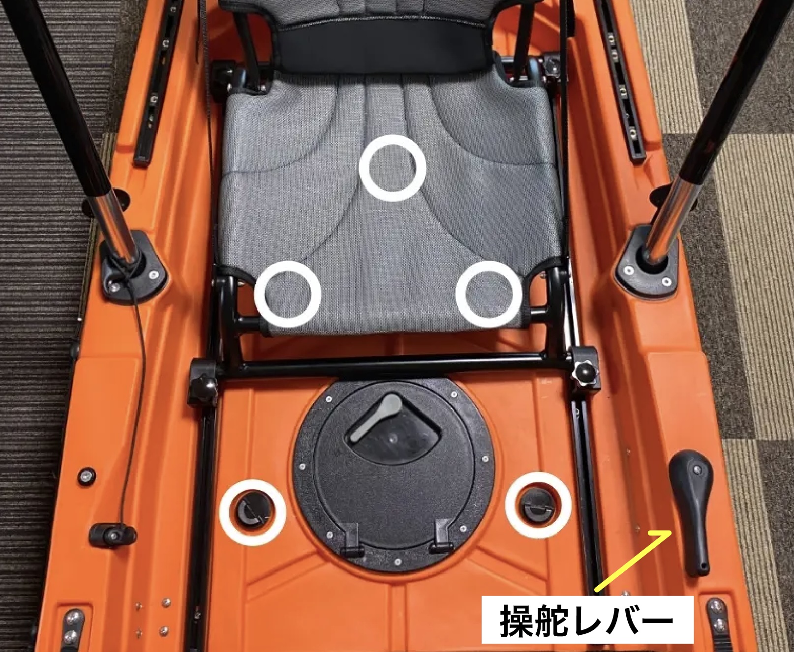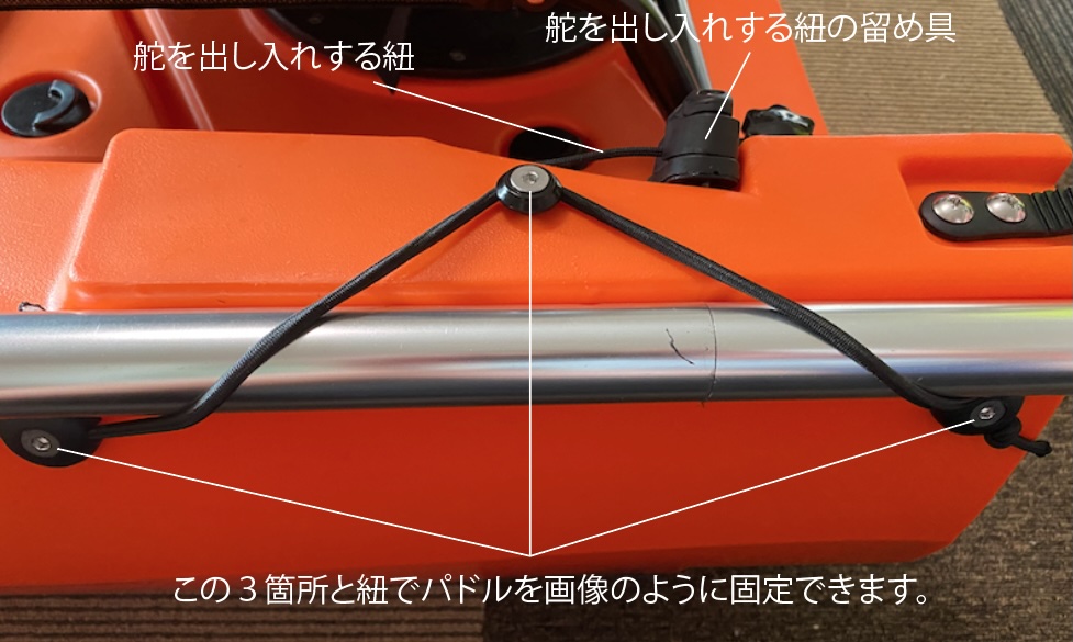 舵と舵操作レバーを結ぶ紐を中継するパーツを固定しているネジです。「なんだこの意味不明なネジ」と思って取ってしまわないよう注意してください。このカヤックに無駄なネジは1つもありません。