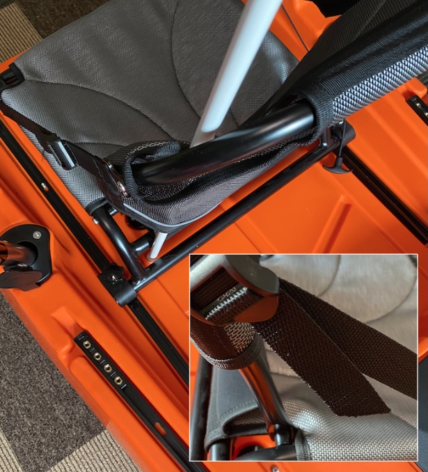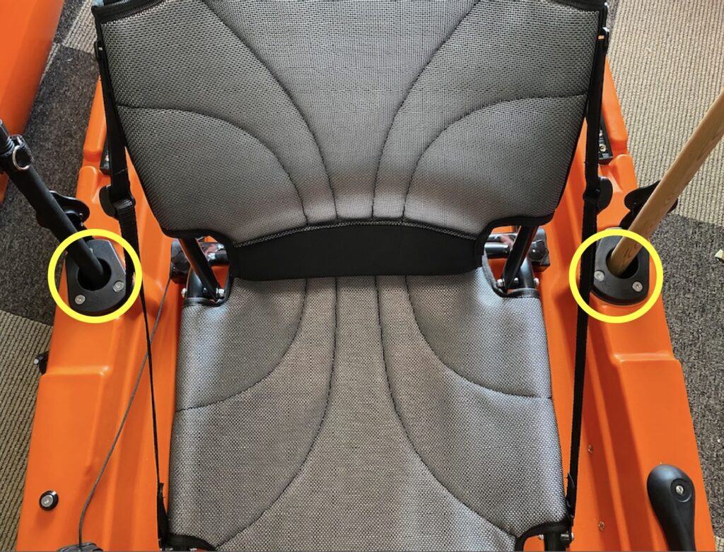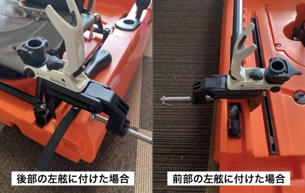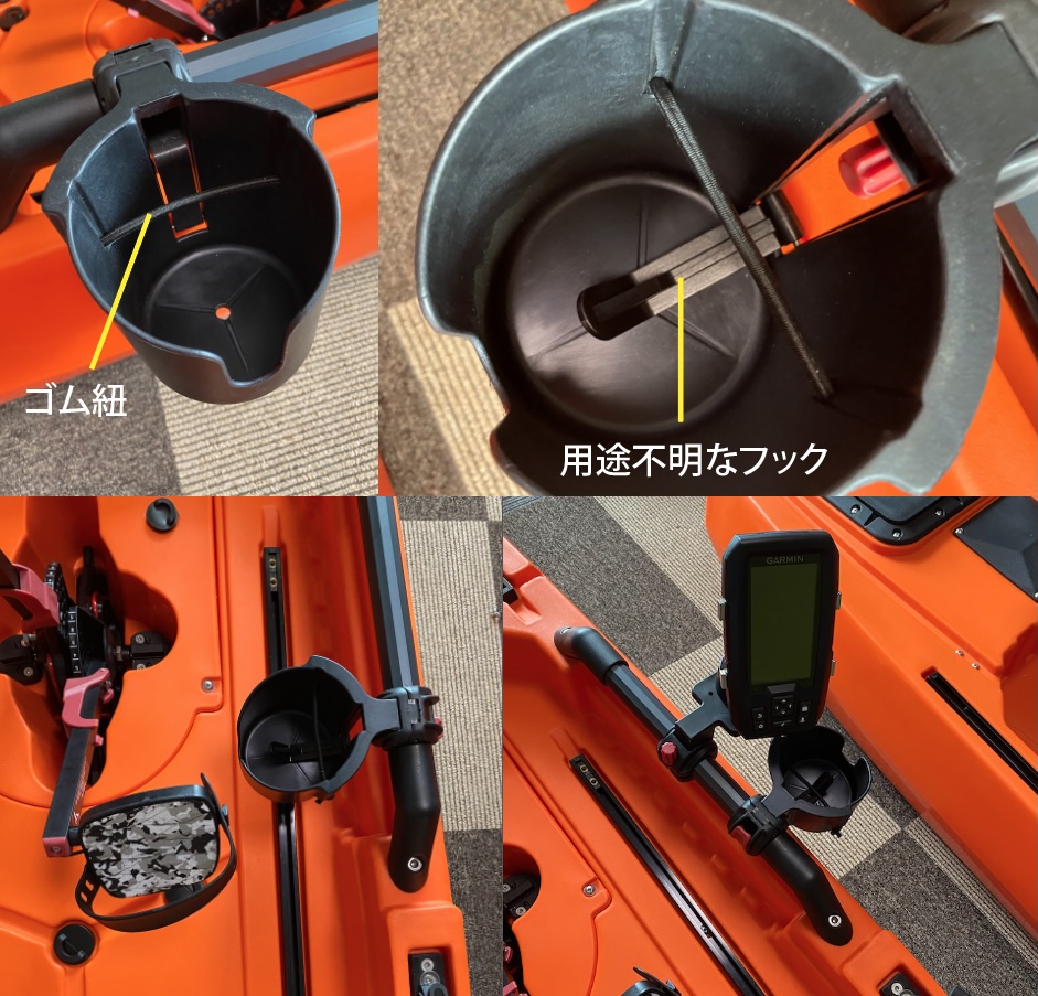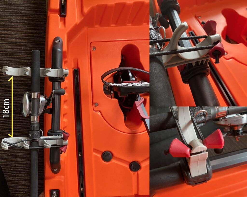 取り付け部分の内径は約30mmで多少調整できるので、直径30〜35mmくらい棒などに固定することができそうです。このカヤックだと、左右にあるフレームにジャストフィットです。