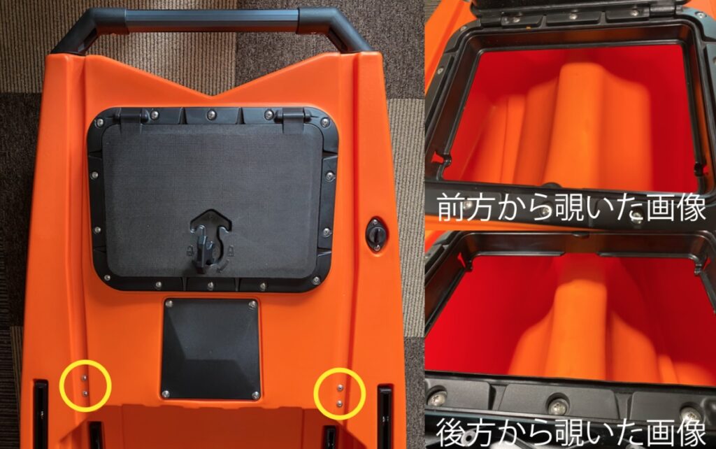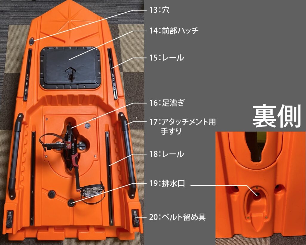 排水口は前後で8箇所あります。排水口は全て中が空洞の柱になっているので、排水兼カヤックの強度を維持するための柱となっています。排水口の辺りで立ってもあまり凹んだりしません。