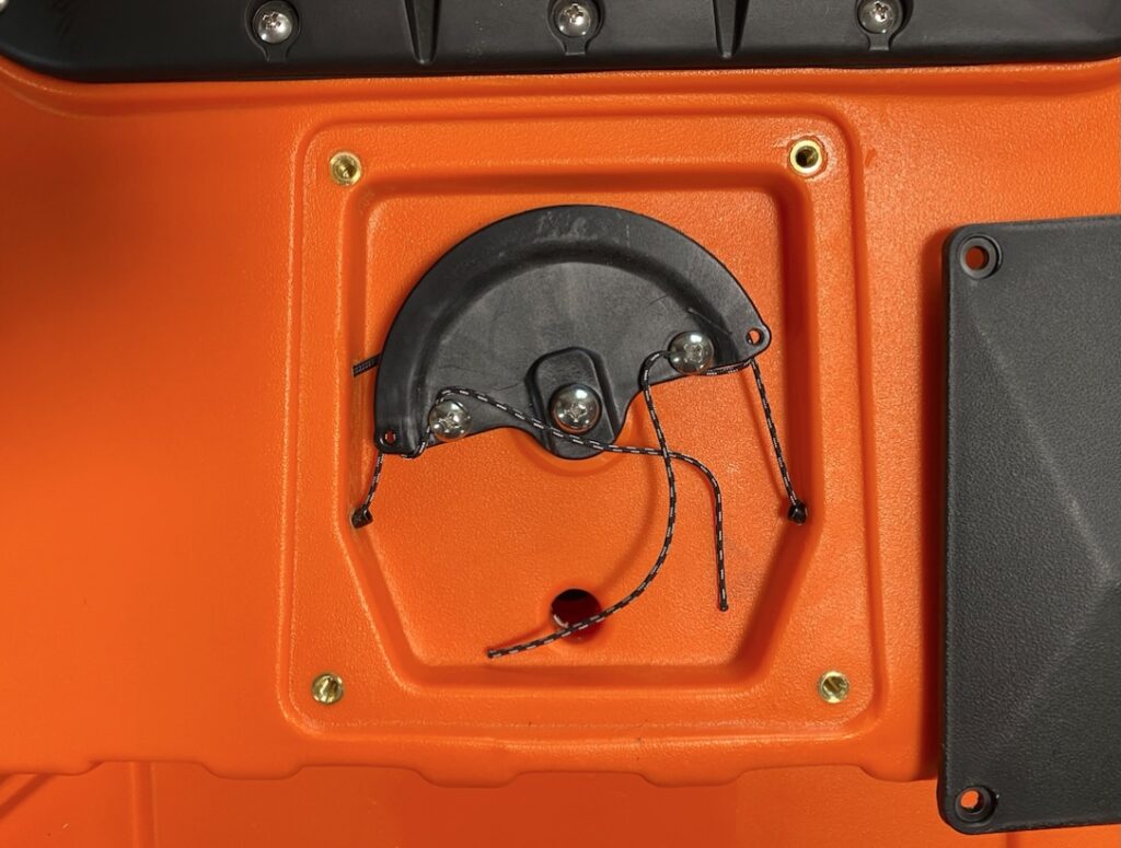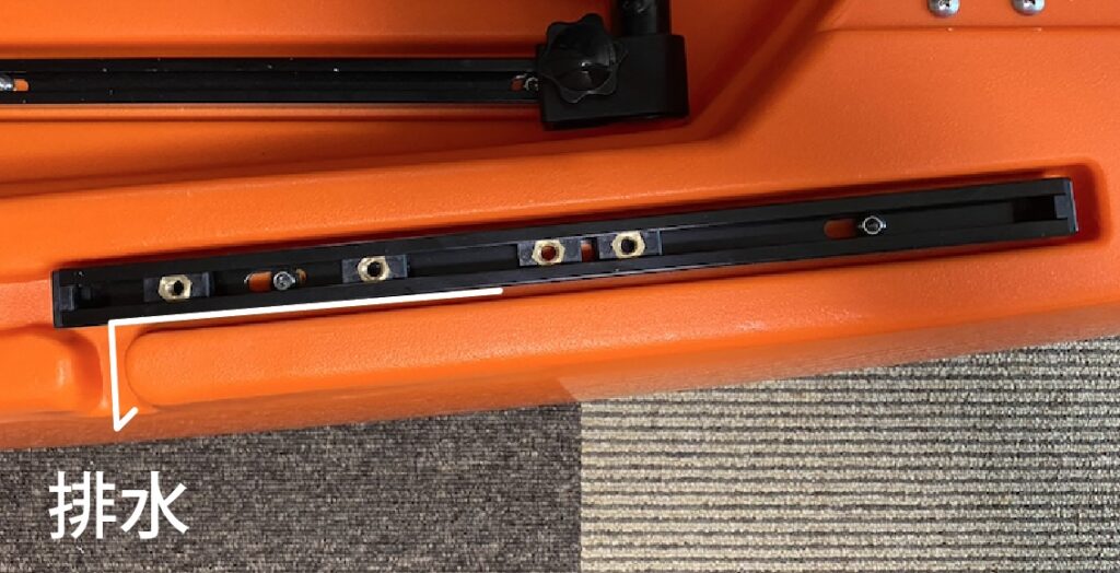 カヤック前部には排水口が3箇所あります。中央の排水口は船底の魚探振動子取り付けスペースとつながっています。この場所に振動子を取り付けた場合は、この排水口にコードを通すことになります。