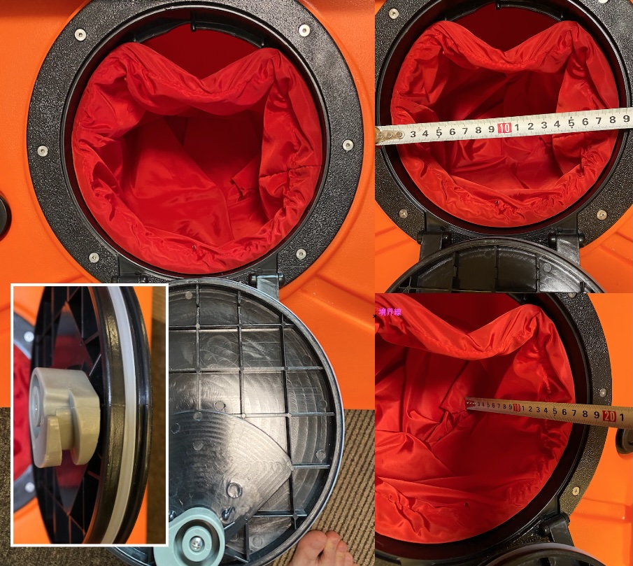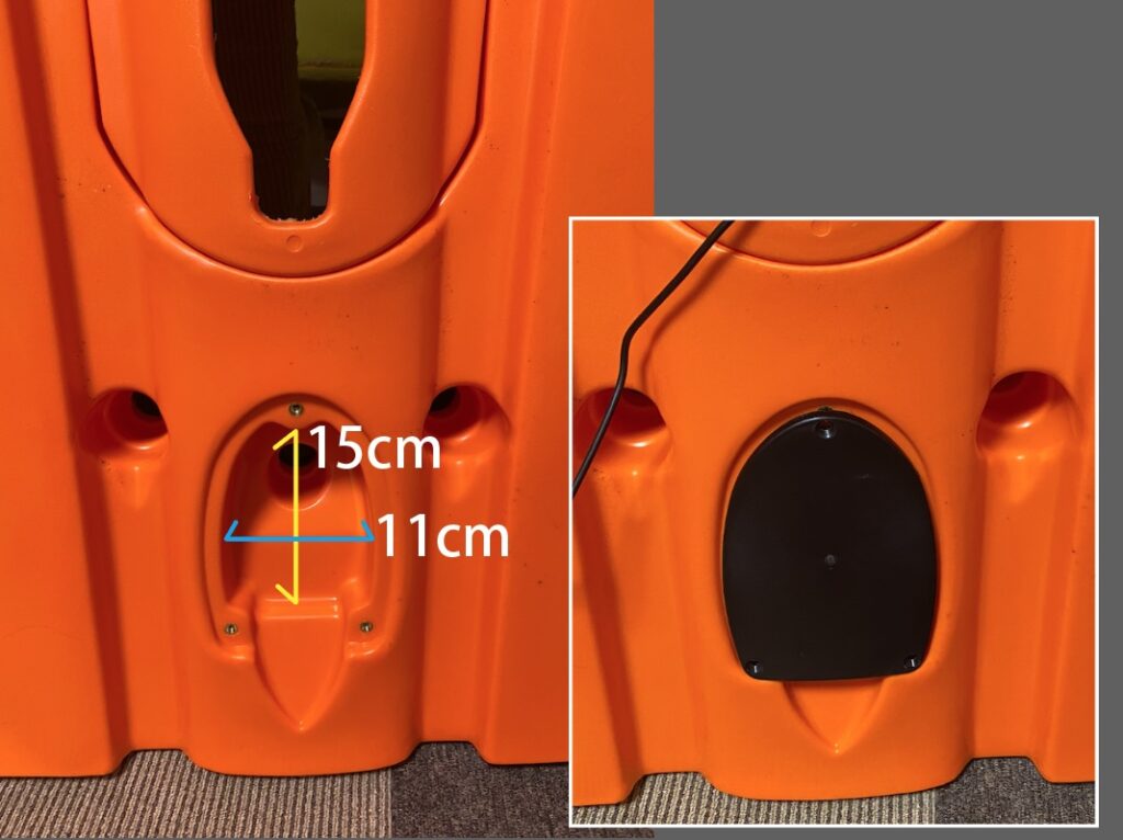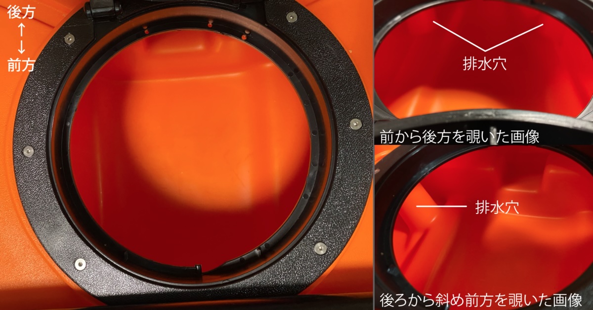 椅子両脇の穴の大きさは深さ18cmで内径35mmくらい。中に貫通していないので水が溜まります。一応キャップも付いています。