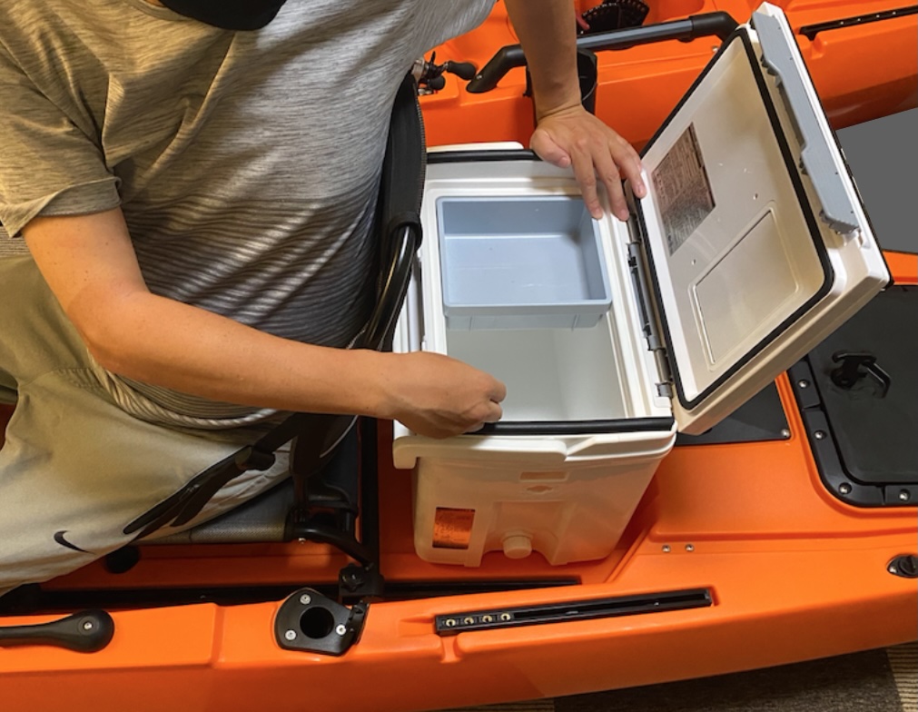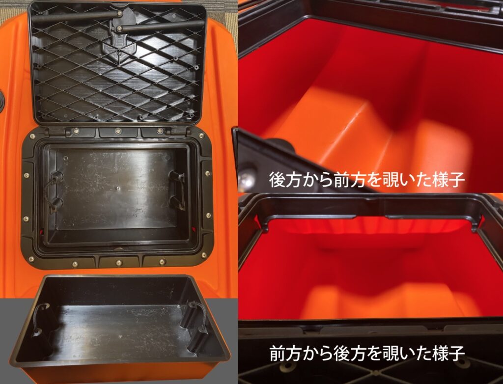 後部ハッチと同じ形状のものです。前部には舵がないので、後部ハッチよりスペースがあります。また簡単に取り外せる深さ7cmのトレイも付いています。
