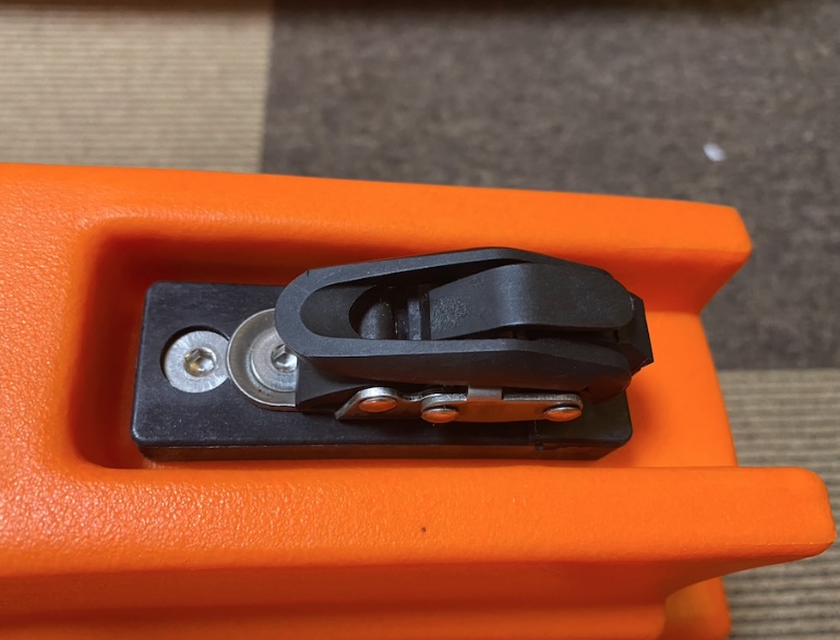 後方のベルトをこの留め具に挿したら、ベルトが引っこ抜けないか引っ張ってみて確認してみてください。