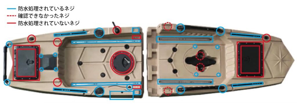 排水口以外に排水できる場所は、カヤックの結合部や足漕ぎペダルの開口部からも排水されるので、排水能力は充分です。ちょっと波をかぶって海水が入ってきても、すぐに排水されます。